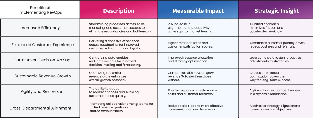 This table summarizes the key advantages of implementing Revenue Operations (RevOps) within an organization, highlighting measurable impacts and strategic insights that drive sustainable growth and operational efficiency.
