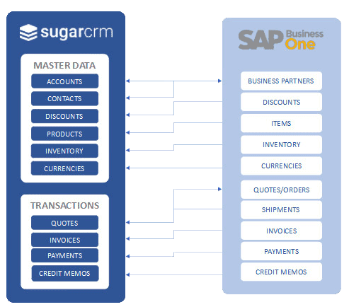 - Synchronizes Product/Item Master, Price Lists, Price Books, Discounts, Currency Master, Shipment Status, Invoices, Payments, Credit Memos from SAP B1 to SugarCRM