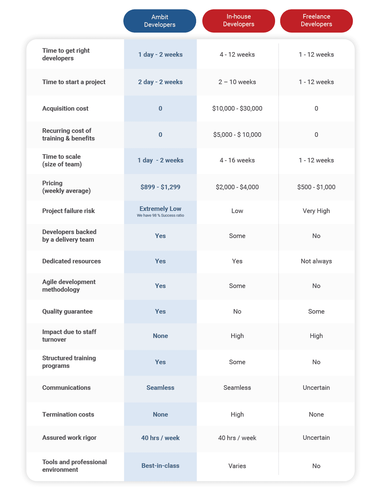 | Ambit Developers | In-house Developers | Freelance Developers | |