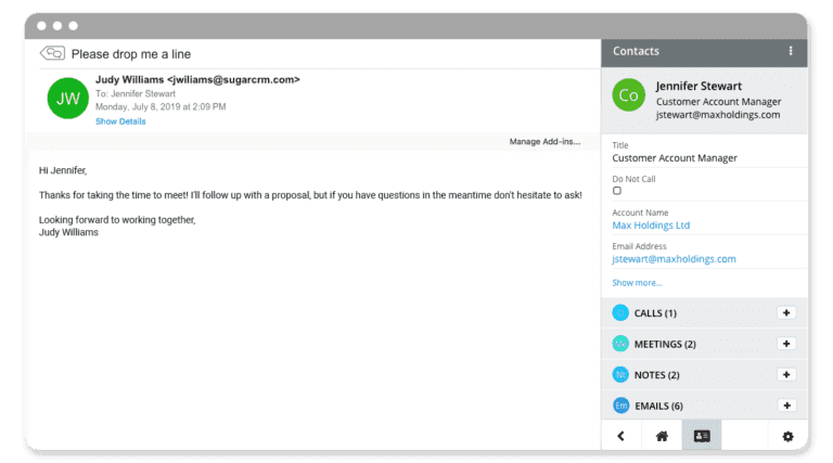 Keep track of your most critical customer interactions and information, without ever leaving Gmail. Sugar Sell lets you sync calendars, track emails, monitor social media activities and more. You can seamlessly manage tasks, opportunities, and cases as you communicate with customers, and save emails to your CRM with a single click—no need to copy, paste or open another app.