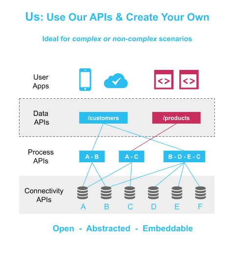 APIs are open and accessible to developers, allowing them to be reused almost infinitely. Cloud Elements makes all your integration artifacts API-accessible so you can call composite process and data APIs to compose new solutions faster.