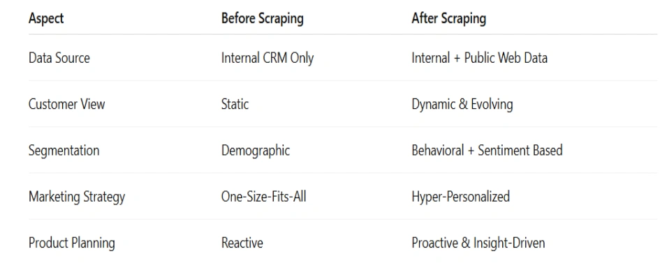 Web scraping automatically extracts real-time and structured data from multiple websites. Since modern tech-enabled consumers interact with dozens of digital touchpoints before making a final purchase, it opens an absolute treasure trove of external insights that strategically sharpens customer profiles, making them more contextual, real-time, and predictive. It doesn’t leave a stone unturned in unearthing customer insights as it mines data from: