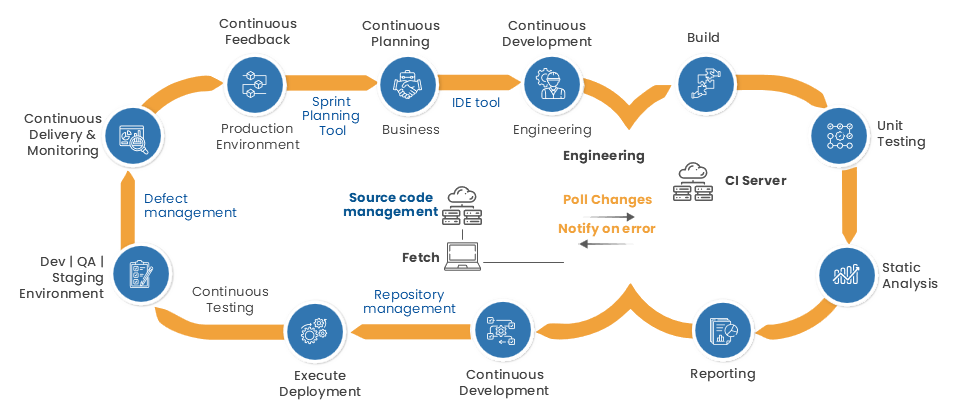 Our Development Methodology integrates DevOps principles and a robust CI/CD pipeline to ensure a seamless, iterative process from planning to deployment. Starting with continuous planning and feedback, we utilize tools like sprint planning and IDEs to maintain an efficient workflow. At each stage — build, testing, and deployment— our CI server automates critical tasks, including unit testing, static analysis, and defect management. This DevOps-driven approach with CI/CD practices enables continuous monitoring and rapid issue resolution, fostering agility and innovation through each development phase.